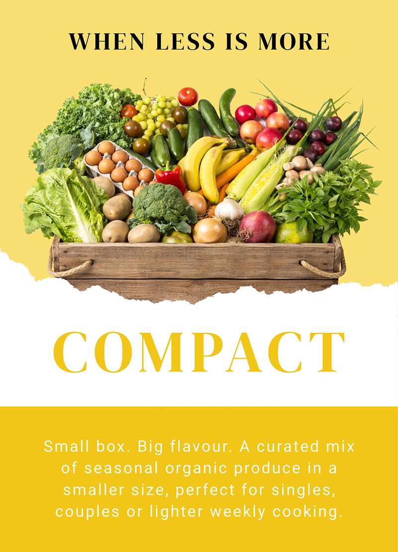 Small in size but full of flavour, the Compact Box is a thoughtfully curated mix of seasonal, certified organic vegetables, herbs and fruit grown with care on our farm and sourced from trusted organic growers.